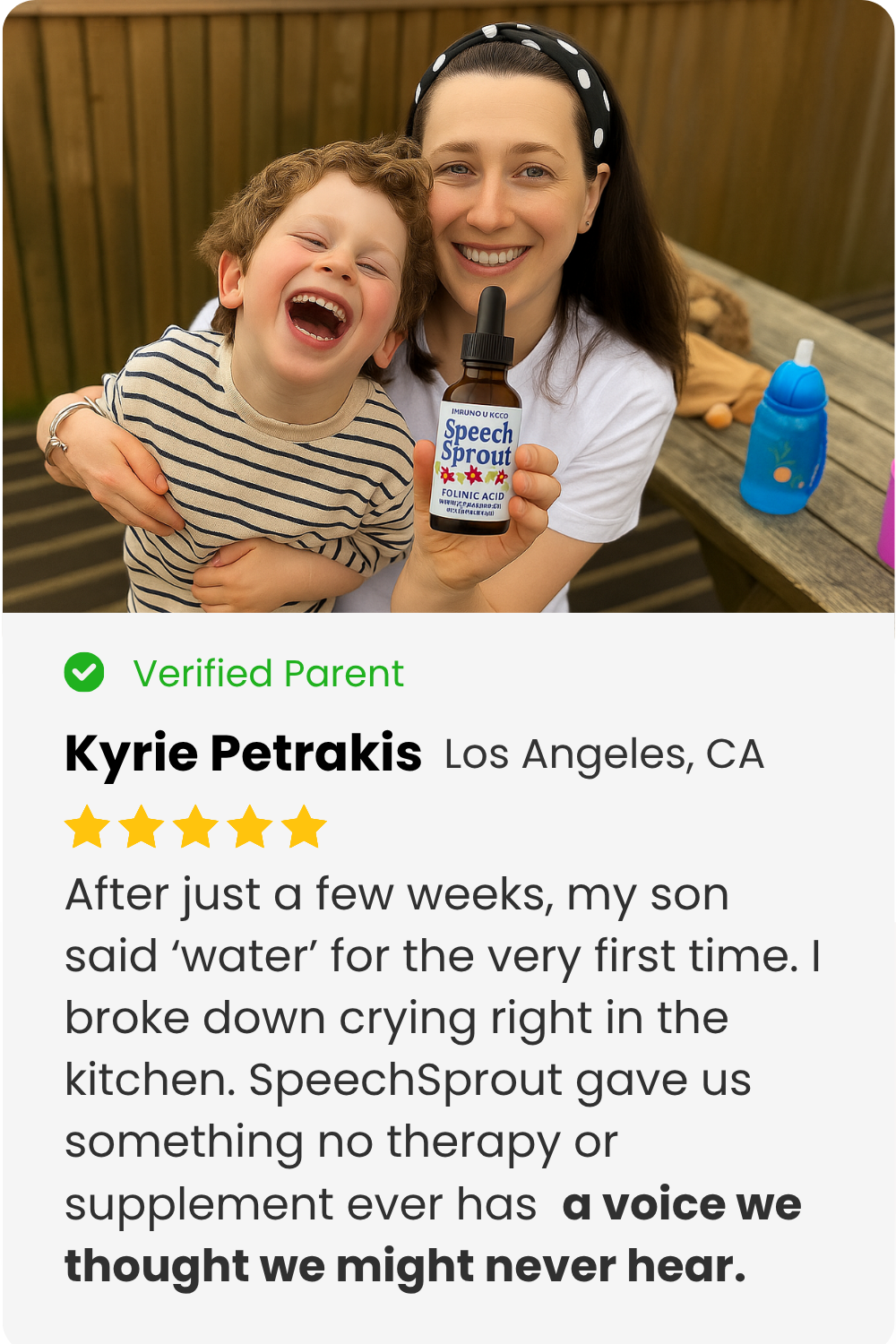 Most kids can’t fully convert folic acid into the active form the brain uses. SpeechSprout™ contains folinic acid — the ready-to-use form that bypasses that conversion issue and goes straight to fueling the brain’s communication pathways. That’s why parents who saw no results with other supplements finally see breakthroughs here.